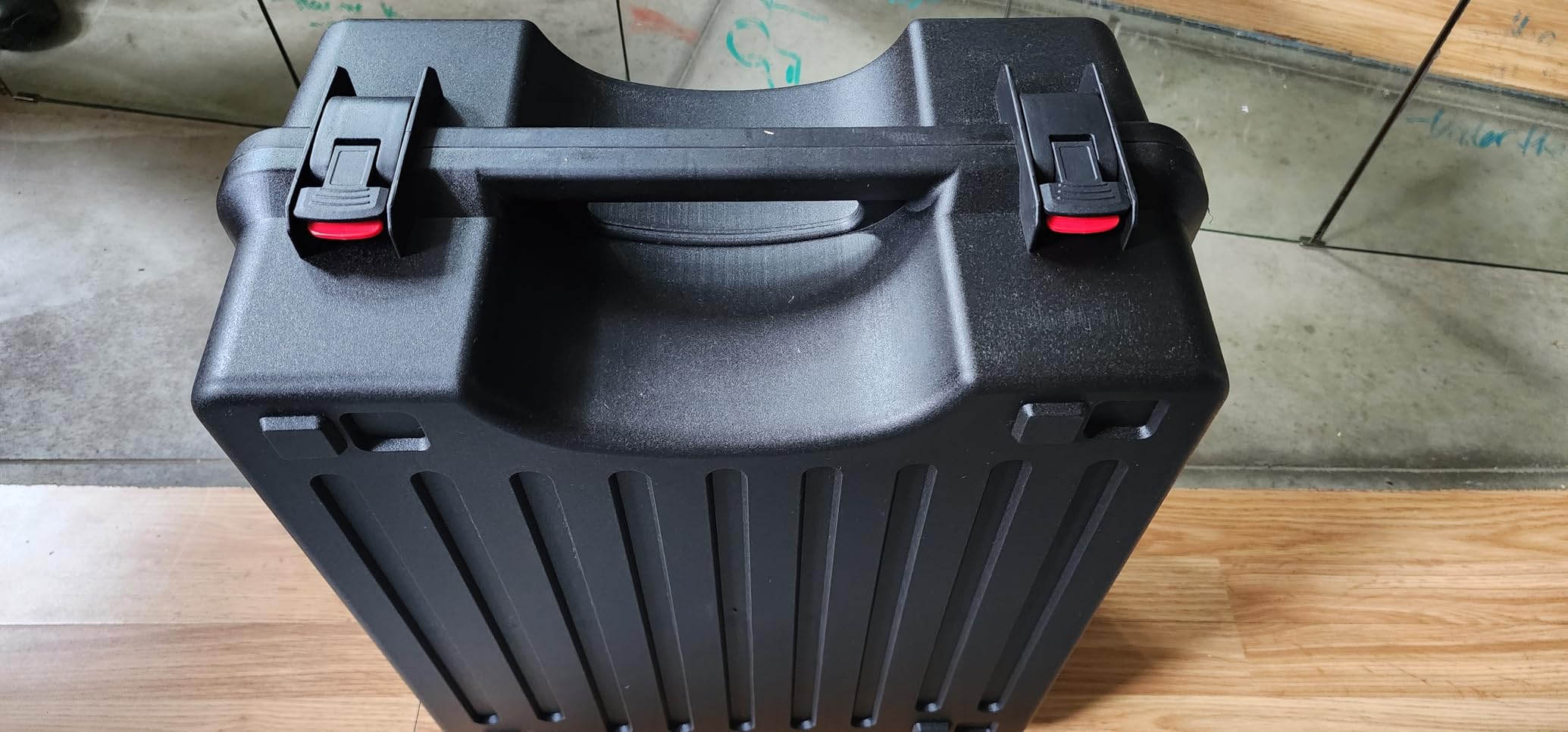 “The case itself is hard plastic and the snaps have an awesome red button to release the latches.”